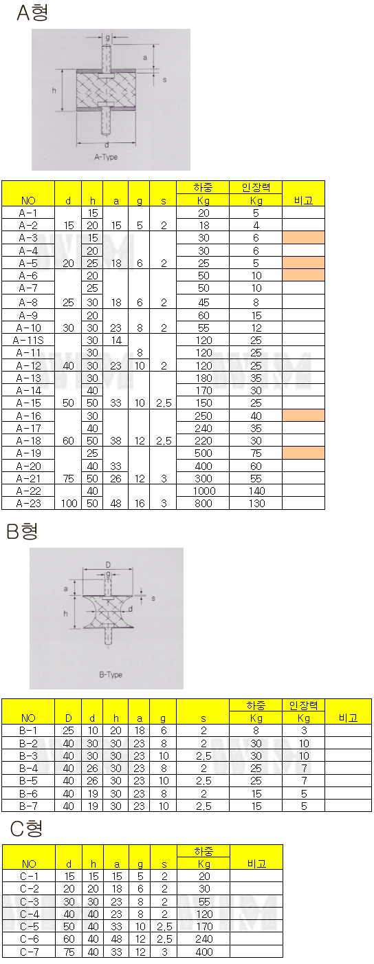 정의 산업현장에서 발생하는 기계진동을 완충하고 소음을 감소시켜준다. 폐사의 제품은 저가형 방진고무와 달리 볼트와 방진고무를 일체형으로 만들고 2번에 걸쳐 bonding처리하여 심한 진동에도 볼트와 고무가 따로 분리되는 일이 없으며 고급 내유성 고무 사용으로 제품의 내구성을 높임. (주문사항에 따라 스테인리스 볼트,와사 및 고무재질 변동가능)